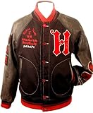 Hudson Outerwear presents a throwback to the ultimate varsity jacket. Featuring a 100% cotton body with genuine leather sleeves, this jacket is accented by its intricate detailing. Purposely given the worn out, aged look. Beautiful jacket all around.
